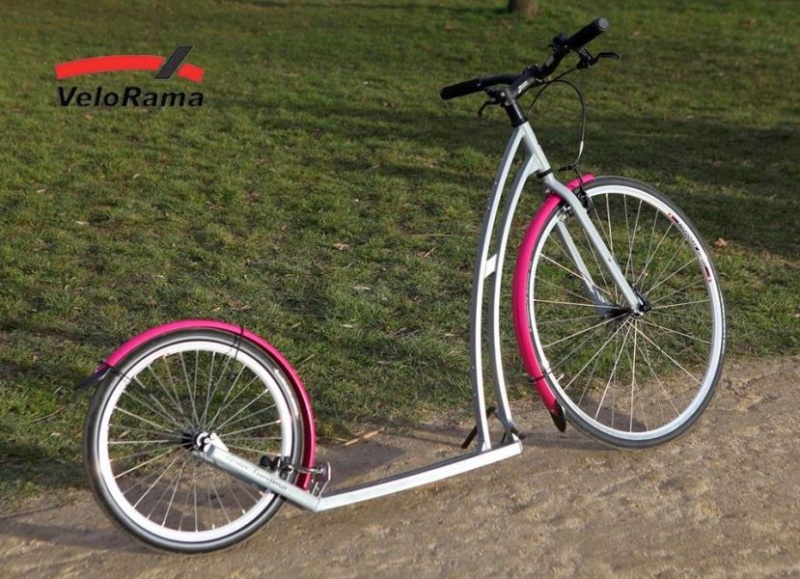 Co je podstatného na tom, když postavíte koloběžku kolem silničních kol? Obvykle to znamená, že optimalizujete i zbytek koloběžky na ta silniční kola. Uděláte nízkou silniční vidlici a osadíte ji silničními brzdami.