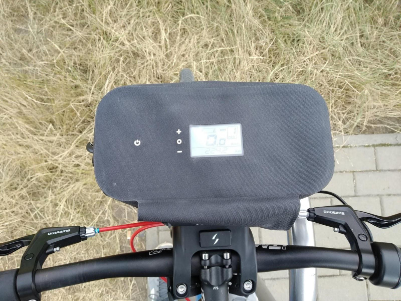 Displej s ukazateli je součástí brašny. Zobrazuje rychlost, velikost přípomoci, stav baterie a další základní údaje podle nastavení (ujeté kilometry, čas atd.) Vše je vodotěsné. Vyzkoušel jsem to asi v půlhodinovém dešti a žádné problémy se nevyskytly.