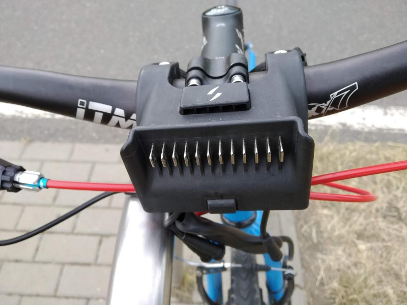 K povolení matek je potřeba čtrnáctka klíč, který není běžnou součástí nářadí na cestu. Před samotným vytažením kola je ještě třeba odpojit napájecí kabel. Opět to jde celkem snadno, ale při zpětném připojení kabelu musíte mít dobré oči, dobré světlo nebo dobré brýle. Šipečky na obou koncích konektoru, které musí být naproti sobě, jsou pro stárnoucí oči téměř neviditelné.