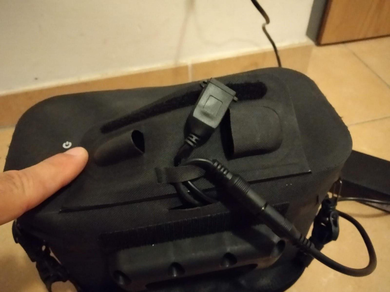 Baterie se dobíjí připojením nabíječky na konektor, který je schován v horní části brašny. Vedle něj je ještě USB konektor určený k připojení dalšího zařízení během jízdy.