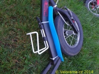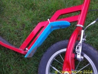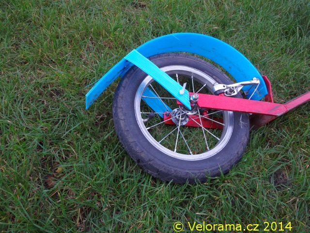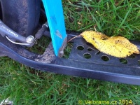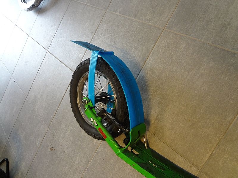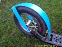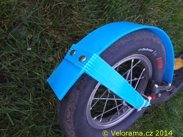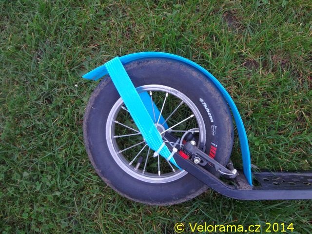 Proto naše koloběžky a koloběžky našich přátel a známých osazujeme punkovými koloběžkovými blatníky z plastové hmoty podobné papírové lepence z krabic od kol. Jsou nesmrtelné a stojí … skoro nic. Máte-li chuť osadit si kolobku podobnými tak to děláme za finanční ekvivalent dvou piv :-). Jsou vystřiženy z plastového odpadu – plastové lepenky (americký název je coroplast, českých je několik a přesně nevím, bo je to odpad z firmy Zenit, kde tím byly proloženy pláty plexi). Vzpěra zadního blatníku je vystřižena z téhož plastu, dohromady je to snýtováno sedlářskými nýty z prodejny Kutil na Florenci. Chcete-li takto oblatníkovat koloběžku přijďte, vyrobíte-li si podobné blatníky vlastnoručně pošlete prosím fotku (email, FB).