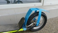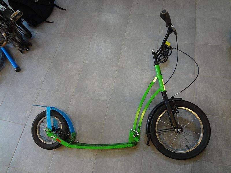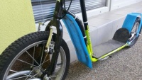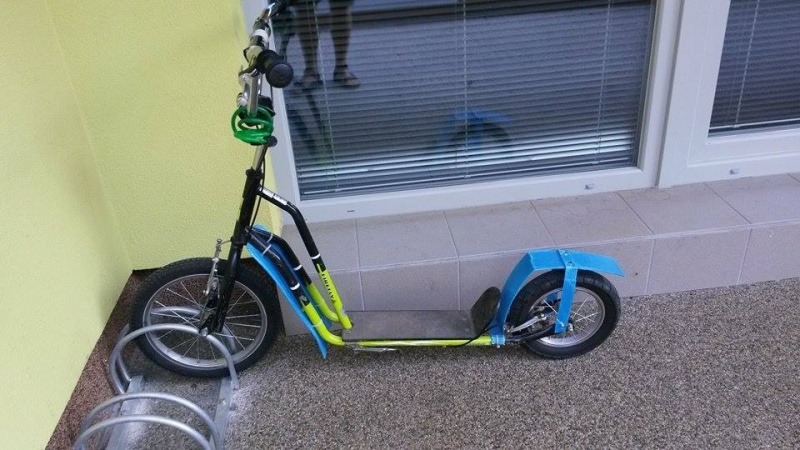 Koloběžka Mibo Mastr náhodného zákazníka, co plechový originál postupně zničil a nahradil s naší pomocí punkovými homebrew blatníky.