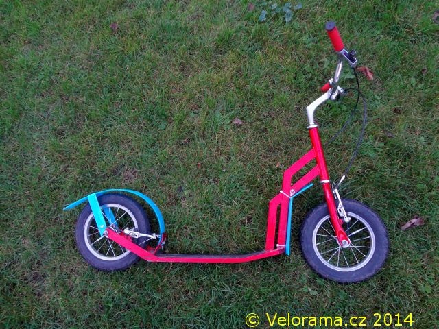 Starší malá MIbo koloběžka na 12-ti palcových kolech pořízená z bazaru – Courage nebo možná Gepard opatřená punkovými koloběžkovými blatníky.
