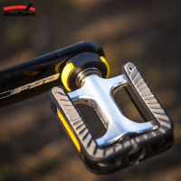 Pravý pedál je po stisknutí žlutých tlačítek demontovatelný a ukládá se do držáku pod sedlem