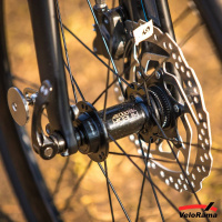 Náboje kinetics a kapalinové kotoučové brzdy shimano. Placička vlevo je jedna strana systému magnetix tj. protikus magnetu držícího balíček složeného kola pohromadě