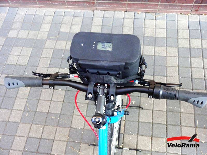 Baterie je v nenápadné řídítkové brašně. Jednduše sundáte i nandáte, v noci svítí intenzitou 200 lumenů. má reflexní prvky - a ukazuje, kolik W jste právě svým odrazem ušetřili :)