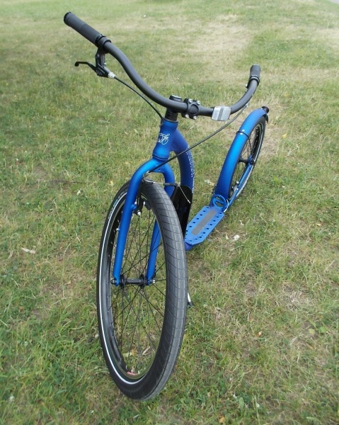 Tahle koloběžka je sice nádherně modrá, má i sympaticky oblé tvary, ale je velká. Prostě max. Musím přiznat, že na takhle velké koloběžce jsem ještě nejela, takže v první chvíli na mě působila jako obr, který se mi na projížďky městem moc dobrý nezdál. Možná mě mátlo i obutí, balonové pláště mi fakt připadaly zbytečně velké a mohutné, vhodné spíš do terénu. V průběhu jízdy jsem dospěla k názoru, že se na nich skvěle jezdí, perfektně pruží a zvládají všechny nerovnosti, takže by se na téhle koloběžce dalo pohodlně drandit i centrem Prahy plným dlažebních kostek.