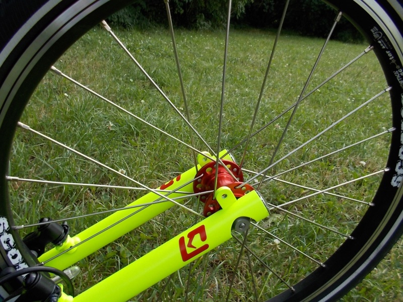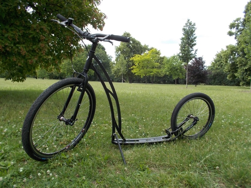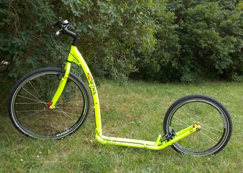 Takže pokud si k malé koloběžce od Kostky chcete pořídit i její velkou sestru, domnívám se, že vám přesedlání nebude činit žádné potíže. Ženy u tohoto modelu jistě okouzlí barevné provedení – reflexní žlutou barvu rámu doplňují červené středy obou kol (náboje), které ladí s červeným logem na viditelných místech rámu. Výhodou jsou úzké náboje, což je příjemné zejména vzadu, neboť se tak snižuje riziko pohmoždění hlezenních kloubů. Pláště na této koloběžce jsou ve srovnání s předchozími dvěma užší a hladší, takže bych koloběžku spíš proháněla po silnici, zpevněných cestách a v lehčím terénu. Mezi rovnými řidítky a jezdcem je dostatečný prostor, takže nohu lze při odrazu zvedat bez omezení a koloběžku bez jakýchkoli úprav použít pro sportovní jízdu. Pokud mohu srovnávat, tak větší kolo skutečně přidává na rychlosti, ale ubírá na obratnosti, takže do projížďky po městě bych se moc nehrnula, na výlety a dlouhé vyjížďky bych však jela hned – když se totiž rozjede, tak jede dobře a rychle…