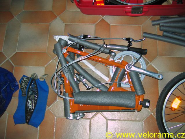 Kufr musí být poměrně veliký, aby pobral šířku složeného rámu kola a to je 33cm. Z nabídky Samsonite kufrů vyhovoval jediný. Po telefonátu na jejich pražské prodejny se ukázalo, že jeden takový v jahodové barvě mají skladem na prodejně ve Zličíně v centru Metropole Zličín. Paní vedoucí byla velmi ochotná a povolila mi vyzkoušet si zda nekoupím zajíce v pytli. Dorazil jsem tedy vybaven nářadím a kolem na Zličín asi 15 min před zavíračkou abych na podlaze prodejny kolo rozebral a zkusil vložit do kufru. Povedlo se a kufr jsem na místě zakoupil. Druhá část fotek už je z ostrého balení kola na zámořský výlet. Celá příprava kola do kufru zabere cca 10min a je na ní potřeba ukázané nářadí. Klíč č.15 na demontáž pedálů a imbusy na demontáž blatníků. Větší imbus a 10/8 klíč je na demontáž plechových držáků bl atníků na korunce přední vidlice a příčce zadní stavby. Plasty jsou kryty z původního balení kola v krabici, ve které se prodává a trubky jsou kousky izolace na vodovodní potrubí.