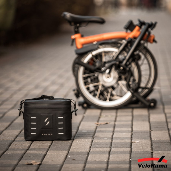 Swytch je klasická elektrifikační sada do předního kola se speciálně zúženým motorem pro tenčí vidlici bromptonu. Autoři se snažili a umístili vše ostatní do úhledné brašny montované na řídítka. Baterie a elektronika sdílí tuto brašnu a instalace kitu je dostupná i šikovnému amatérovi. Součástí sady je přední kolo s motorem, kabely, držák brašny na řídítka a brašna s baterií a elektronikou.