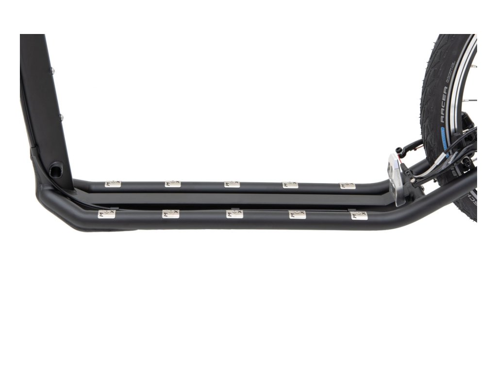 Díky velikosti předního kola 26palců si koloběžka poradí i s polní či lesní cestou. Je osazena plášti Schwalbe Marathon Racer, lehkým a rychlým univerzálním obutím které je doma na asfaltu ale nezradí ani na šotolině či lesňačce.