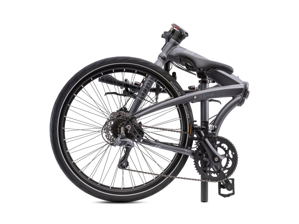 Velké skládací kolo TERN Eclipse D16 Tern Eclipse je klasickou skládačkou, ale díky svým 26" kolům a 16 rychlostem nabízí mnohé navíc. Při jízdě na něm můžete uhánět jako ďas nebo se naopak jen kochat krajinou – je to kolo, které vám umožní užít si jízdu na maximum. Pohodlnou jízdu tomuto krasavci zajišťují 26“ kola s plášti Schwalbe s ochranou proti propíchnutí, tedy vás na cestách nic nepřekvapí. Kolo dále disponuje kvalitní přehazovačkou Shimano s 2x8 rychlostmi a hydraulickými diskovými brzdami od stejného výrobce. Díky této výbavě si s kolem hravě můžete troufnout i do členitého terénu. Skvělá je i technika jeho skládání, Tern Eclipse D16 snadno složíte za 10 sekund díky jednoduchému systému páček uprostřed rámu a na řídítkách. Součástí výbavy tohoto krasavce je i nastavitelný představec Andros pro ideální pozici sezení. Hledáte-li kolo do města i do lehkého terénu, které snadno složíte a hodíte do kufru nebo ho uložíte v malém bytě, pak jste našli svého výherce. Tern Eclipse v sobě totiž kombinuje to nejlepší ze skládaček i z městských kol. Je to prostě hrdina.Doplňkové parametry